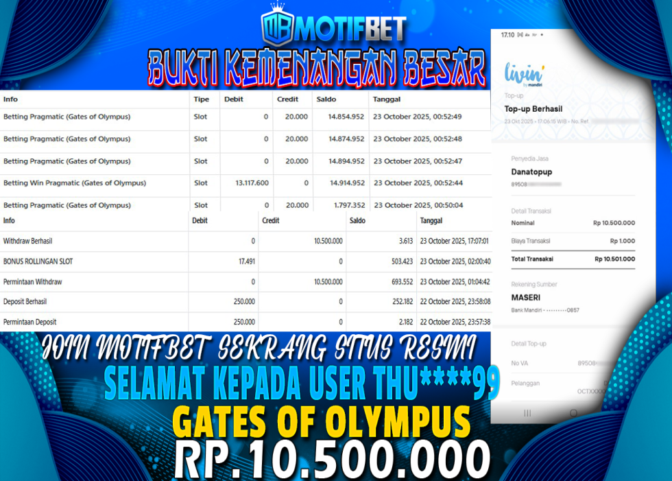 MOTIFBET JACKPOT GATES OF OLYMPUS 1000 Rp.10.500.000,- LUNAS