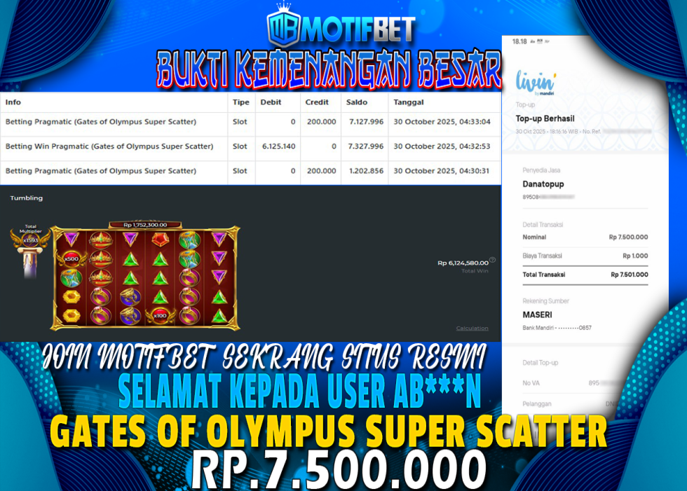 Selamat kepada User id : AB****NTelah berhasil mendapatkan kemenangan besar pada permainan GATES OF OLYMPUS SCATTER kemenangan Sebesar Rp.7.500.000,Setelah mengisi formulir withdraw pihak MOTIFBET SEGERA melakukan PROSES transfer kepada pemilik Userid dan dana sudah dapat di cairkan oleh pemenang. Bukti pembayaran yang kami berikan merupakan bukti pembayaran yang SAH / VALID yang langung di dapatkan melaui tanda transfer transaksi dari Bank yang di tuju.