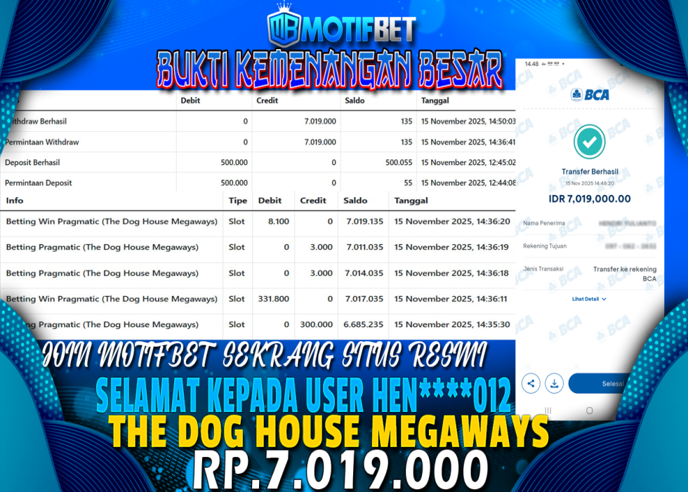Selamat kepada User id : Hen****012 Telah berhasil mendapatkan kemenangan besar pada permainan The Dog House Megaways kemenangan Sebesar Rp.7.019.000,Setelah mengisi formulir withdraw pihak MOTIFBET SEGERA melakukan PROSES transfer kepada pemilik Userid dan dana sudah dapat di cairkan oleh pemenang. Bukti pembayaran yang kami berikan merupakan bukti pembayaran yang SAH / VALID yang langung di dapatkan melaui tanda transfer transaksi dari Bank yang di tuju.